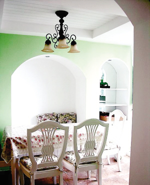 就餐環(huán)境的色彩配置對(duì)家人的就餐心理影響很大。孫女士在裝飾餐廳時(shí),選擇淺綠色為主色調(diào),搭配上白色餐桌椅。明朗輕快的色調(diào)不但能增進(jìn)就餐者的興致,刺激食欲,而且能營(yíng)造一種溫馨、甜蜜的氛圍(如圖②)。