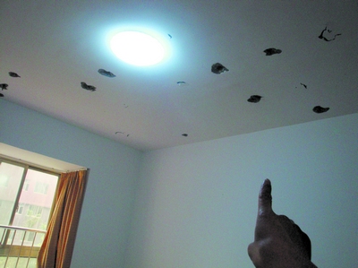12月7日中午,在物業(yè)公司服務的王小姐走進租住的岳麓區(qū)西岸潤澤府小區(qū)6棟307房,立即發(fā)出一聲尖叫,她發(fā)現(xiàn)自己本來干凈整潔的床鋪上散落著大大小小的水泥塊,而本來光潔白亮的天花板出現(xiàn)了幾十個洞。“當時第一感覺以為是發(fā)生了地震。細數(shù)發(fā)現(xiàn),竟有29個洞!焙献獾囊荒泻⒆痈嬖V記者。后來大家明白了,這是樓上裝修引起的問題。