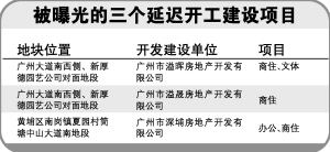 廣州市國土房管局首次在其網(wǎng)站上曝光了三個延遲開工建設(shè)的項目,并發(fā)公函催促其在限期前動工開發(fā)建設(shè)。對逾期仍未動工者,市國土房管局將依法進行處置。