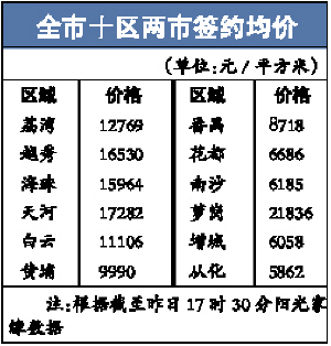 在全市十區(qū)兩市中,依舊是荔灣、越秀、海珠、天河、白云、蘿崗六區(qū)簽約均價(jià)過萬元/平方米。其中,截至昨日17時(shí)30分僅簽約23套的蘿崗區(qū)簽約均價(jià)達(dá)21836元/平方米,全市最高,比9月漲近49%,而這與其簽約的多是大面積豪宅有關(guān),其平均每套簽約面積達(dá)188平方米,為全市最大。