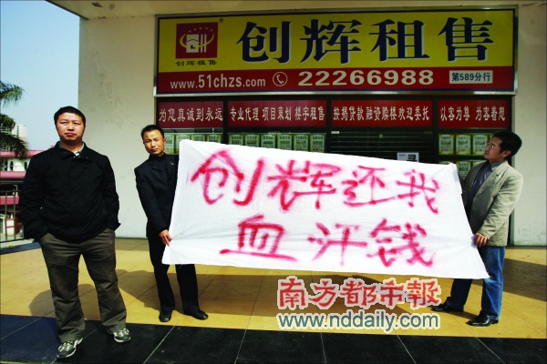有3種人昨日聚集到創(chuàng)輝在各城市的總部———樓房買賣客戶、供應(yīng)商以及欠薪員工?蛻粲懸\意金和首期款,供應(yīng)商討要文具裝修材料的貨款,員工討要去年11月以來的薪水。得不到答復的人們情急之下搬、砸創(chuàng)輝店中電腦、復印機等物品,部分地方的哄搶直到警方到場控制才停止。
