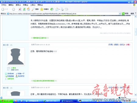 在帖子里“朱小冬”稱,他的這個公寓式樓房位于威海最繁華城區(qū)某大廈10層,已裝修,年租金2萬元左右(已出租),位置在東海邊,1塊錢起拍。為證明絕對真實,他留下了自己的聯(lián)系方式,還提供了參考數(shù)據(jù)“樓上有賣的81m252萬,99m268萬,樓下以前買的36萬,評估公司評的是43萬”。關(guān)于拍賣規(guī)則,“朱小冬”要求,每次加價最低1萬元,最高者就可以拍到。