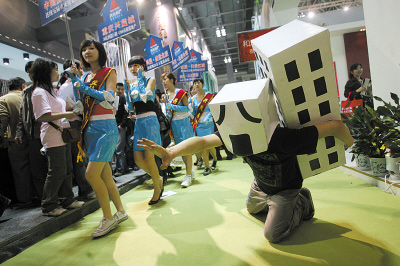 記者在現(xiàn)場(chǎng)看到,這名扮相搞笑的網(wǎng)友大約20來歲,他頭頂一個(gè)大大的紙做的“囧”字,背上則背著一個(gè)高樓模型,在細(xì)雨中雙手抱頭,兩膝跪地,在地面上做掙扎狀。隨后,他分別又?jǐn)[了苦干、解脫等Pose。一個(gè)小時(shí)的表演引來現(xiàn)場(chǎng)上百市民圍觀。由于造型搞笑,動(dòng)作搞怪,在男子表演的現(xiàn)場(chǎng),吸引了眾多“粉絲”,許多市民都與他“合影留念”。與“囧”男一同前來的QQ群友在人群中散發(fā)著20多條自制的網(wǎng)絡(luò)搞怪語言。