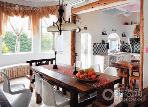 玄關(guān)是室內(nèi)的第一視覺焦點,小米用藍白兩色為這個家點了題,與房子的外立面呼應:白色的墻面,藍色的門板、鞋柜、天鵝頭木盆描繪著浪漫的地中海風情;客廳里條紋圖案的布藝沙發(fā)和花朵圖案的布藝貴妃椅則是典型的鄉(xiāng)村風格,主題墻上點題式地掛起兩幅與海岸相關(guān)的油畫;餐廳里,小米玩起了混搭——上等老榆木的厚重餐桌,兩頭各放一張老榆木餐椅,氣勢穩(wěn)重,兩側(cè)則是四張設(shè)計感很強的白色Panton椅,起初你會覺得有點大膽,再認真審視,又覺得這種碰撞很和諧,小米說:“我喜歡來點驚喜的感覺,這椅子的線條很優(yōu)美,像海浪般起伏,與老榆木的感覺一個新,一個舊,一個輕,一個重,相映成趣。”