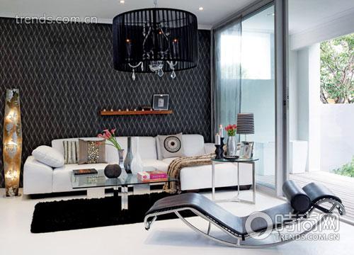 墻壁大面積使用黑底白紋的圖案,給地板留出足夠簡(jiǎn)潔的空間。沙發(fā)上方做出的原木架將發(fā)散的目光重新聚集,照片擺在一側(cè),圓扁的小蠟燭悄悄亮起,讓氣氛一下活躍起來(lái)。水晶吊燈線條優(yōu)美,外面籠罩了一層黑色豎紋裝飾,與沙發(fā)前純黑的地毯遙遙相望,而躺椅完美的弧度在提供給主人充足的休息之余,也配合著前兩者成為屋內(nèi)最為深暗的色彩之一。橫排的白色沙發(fā)顯露出十足的貴族氣息,高高豎在一側(cè)的地?zé)粢蚕鄳?yīng)地做出漂亮的大花圖案,亮燈時(shí)花朵若隱若現(xiàn),朦朧之美呼之欲出。