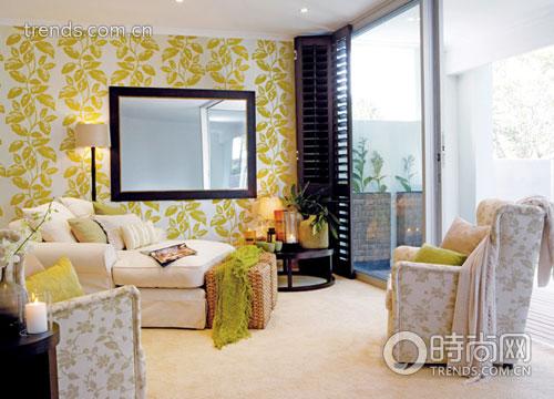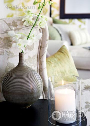 布藝沙發(fā)也同樣遵循了花色與純色混搭的原則,奶白色的雙人沙發(fā)用淺灰綠的靠包來點綴,分坐兩旁的單人沙發(fā)則使用枝葉與花朵的暗紋來處理,旁邊配上深色的小茶幾,精致的圓肚細頸花瓶里悄悄探出一枝素雅的白色蝴蝶蘭,跟玻璃罩內(nèi)點燃的白色蠟燭相映成趣。
