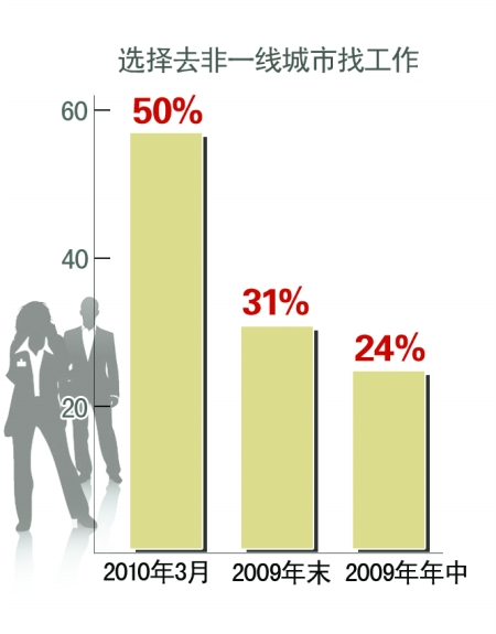 前程無憂組織的“今年三月,去不去一線城市工作”的網(wǎng)上投票中,有50%的人選擇去非一線城市找工作,而這一比例在2009年年末為31%,2009年年中為24%。