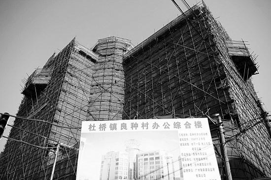 說它是熱帖,準確地說其實就是一組照片。照片中,一幢大樓拔地而起,主體框架已搭建完畢,不過由于尚未完工,整幢大樓像是穿上了一層漁網服。大樓底下立著一塊規(guī)劃牌,最上面寫著“杜橋鎮(zhèn)良種村辦公綜合樓”,中間是大樓的效果圖,9層高的大樓看上去頗為壯觀。