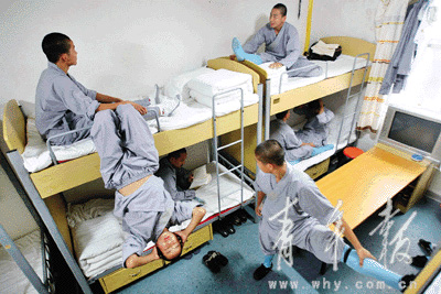 記者昨天在武僧們的房間內(nèi)看到,雖然是10人間,除了窗臺(tái)搭桿上有幾件僧衣在晾曬,公共空間里沒(méi)有放置其他私人物品,房間反倒顯得空蕩蕩。10張床上,被子被整齊地疊成豆腐塊,并統(tǒng)一放置在靠窗的床頭,房間顯得整潔劃一。一位武僧告訴記者,從開(kāi)始進(jìn)入少林武僧團(tuán),他們便開(kāi)始養(yǎng)成了“軍事化”內(nèi)勤習(xí)慣,“武術(shù)表演講求嚴(yán)謹(jǐn)和團(tuán)隊(duì),這種整齊劃一的內(nèi)勤也是在培養(yǎng)大家的細(xì)致和團(tuán)結(jié)的品質(zhì)!