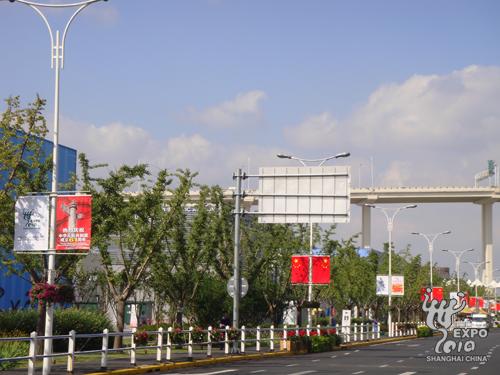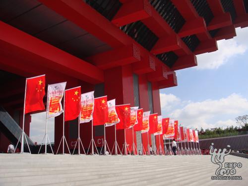 中國國家館9米、14米平臺及周邊地區(qū)、世博大道、各出入口和世博軸相關(guān)區(qū)域都進行了精心布置,共懸掛招風(fēng)旗近400對、墻貼20余幅、巨幅插旗24面,園區(qū)處處洋溢著濃郁的節(jié)日氣氛。