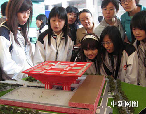 二0一0年上海世博會中國國家館外觀“東方之冠”的模型前,來自石家莊鐵道學(xué)院的大學(xué)生們對這個類似中國古代官帽的建筑興趣頗濃。