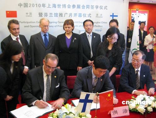 11月5日,芬蘭政府正式簽約參展中國2010年上海世博會,上海世博會芬蘭政府總代表胡毅督(左)與上海世博局局長洪浩在上海簽署參展合同。據(jù)介紹,芬蘭政府計劃投入約1400萬歐元,在上海地標盧浦大橋畔的世博園區(qū)建造占地3000平方米的芬蘭國家館,該館定名為“冰壺”。為期一個月的“上海世博會芬蘭推廣月”也自5日起在上海拉開帷幕。中新社發(fā) 許曉青 攝