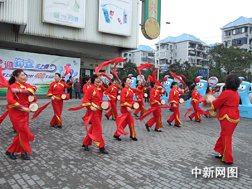 在長(zhǎng)青路、成山路口的華聯(lián)吉買(mǎi)盛廣場(chǎng)四周,23個(gè)2米高1米寬笑容可掬的海寶圍著一圈,不斷地向前來(lái)參加活動(dòng)的志愿者招手致意。一旁,喜慶的龍車(chē)上,鑼鼓敲得震天響。廣場(chǎng)中央,來(lái)自居民區(qū)的志愿者代表和來(lái)自社區(qū)學(xué)校的紅領(lǐng)巾代表集結(jié)在一起,他們將迎接海寶到小區(qū)。