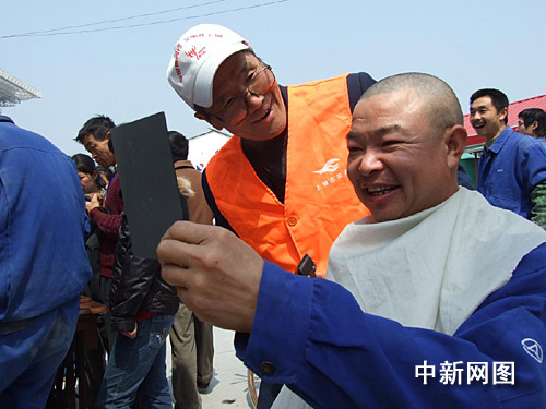 聽說服務“大篷車”要來,工地建設者早早作了準備,穿破的衣褲,穿壞的鞋都拿了出來。一位來自河南,名叫張慶國的25歲民工,由于工地工作忙,已半年沒理發(fā)了,逢午飯休息間,他對理發(fā)的志愿者師傅說:“請幫我理了光頭吧,省得頭發(fā)長難受!10分鐘后,當他拿著小鏡子,照著新理的光頭時,高興地指著腦袋說:“這下可解決了”。一旁,兩位浙江籍青年拿著剛修補好的球鞋,笑得合不攏嘴!吧虾H苏鏌崆,手藝也高。我這修好的球鞋,看不出補丁,真得太好了!
