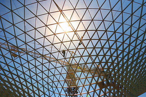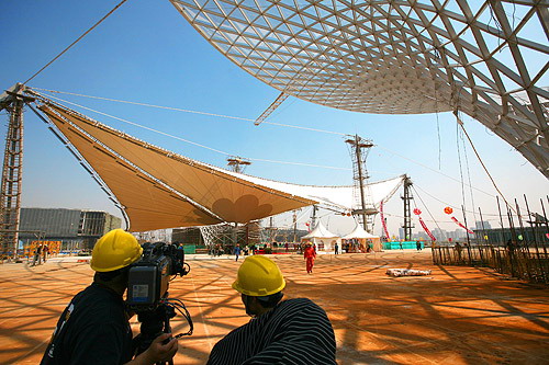 中新網(wǎng)4月30日電 據(jù)上海世博會(huì)官方網(wǎng)站消息,今天,世博軸上首批兩個(gè)喇叭狀的陽(yáng)光谷正式落成,同時(shí)頂棚膜結(jié)構(gòu)張拉啟動(dòng),這標(biāo)志著世博軸上部主體工程即將全面完工。上海世博會(huì)執(zhí)委會(huì)專職副主任鐘燕群、上海世博局副局長(zhǎng)丁浩等出席儀式。鐘燕群宣布啟動(dòng)世博軸頂棚膜結(jié)構(gòu)張拉。