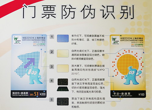 為了讓民眾放心購(gòu)買(mǎi),上海世博會(huì)門(mén)票在防偽方面下足功夫。購(gòu)票者可通過(guò)眼看、手摸、借助紫外燈以及放大鏡等方式判斷門(mén)票真?zhèn)!吧虾J啦⿻?huì)門(mén)票采用了具有自主知識(shí)產(chǎn)權(quán)的芯片技術(shù),其最顯著的特點(diǎn)就是將傳統(tǒng)印刷防偽技術(shù)與電子芯片技術(shù)進(jìn)行創(chuàng)新結(jié)合,具有防偽性能強(qiáng)、獨(dú)占性高、唯一性好、時(shí)效性長(zhǎng)、確保安全可靠等特點(diǎn)!标愊冗M(jìn)介紹說(shuō)。同時(shí),他表示,有關(guān)部門(mén)將嚴(yán)厲打擊非法銷售世博會(huì)門(mén)票的行為,以保護(hù)廣大購(gòu)票者利益。 (徐筍)