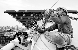 下午兩點(diǎn),記者帶著溫度計(jì)來到世博工地外國館片區(qū),陽光下,水銀柱停留在40攝氏度上。走上5分鐘,汗水濕透了全身。高溫挑戰(zhàn)著每個建設(shè)者的意志力。在法國館將要完成的鋼結(jié)構(gòu)屋頂上,幾個工人正在安裝最后的鋼架,為了避免曬傷,他們穿著長袖長褲的工作服,戴著安全帽。從屋頂爬下來時,每個人都像是剛從水里撈上來的。工人老張說,安全帽不能脫,汗水一刻不停地沿著帽子流下來,眼睛都睜不開,得一直用手擦。