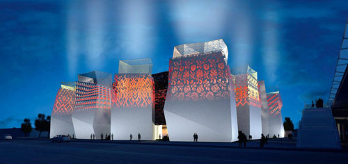 以“新俄羅斯:城市與人”為主題的俄羅斯館由12個塔樓和“懸浮在空中”的立方體組成,外形設計類似古代斯拉夫人的小村落,象征著生命之花、太陽以及世界樹(斯拉夫人枝葉繁茂的橡樹)的根。塔樓由白、金、紅三種顏色構成,白色和金色塑造了俄羅斯建筑的歷史形象,而紅色底色加上富有俄羅斯各民族元素的圖案,則賦予了塔樓頂部鏤空部分以生命力。