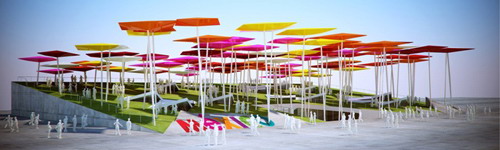 風(fēng)箏廣場是墨西哥館的核心。風(fēng)箏在nahuatl語(民族方言)的名稱是“papalotl”,也就是西班牙語中的蝴蝶。風(fēng)箏是連接墨西哥文化和中國文化的一個(gè)要素。參觀者可以在墨西哥館里購買風(fēng)箏,或者親手做一個(gè)風(fēng)箏,然后在風(fēng)箏廣場上放飛。由風(fēng)箏組成的森林代表著墨西哥人對未來的期待,廣場上的人造綠草表達(dá)了墨西哥人對城市綠地的關(guān)注。人們可以在綠地上進(jìn)行各種活動(dòng),諸如讀書、野餐或是在陰涼處隨意地休憩;綠地上空,風(fēng)箏在飛翔。