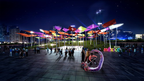 墨西哥館占地面積4000平方米,將展示墨西哥的歷史、文化和夢想。據(jù)墨西哥館相關(guān)負(fù)責(zé)人介紹,進(jìn)入墨西哥館,參觀者就好似開始了一段從史前時(shí)代到未來的墨西哥歷史旅程。展覽的第一部分為“回顧過去”,投影到地板上的三個(gè)屏幕將分別反映墨西哥史前城市、殖民地城市和19世紀(jì)城市的風(fēng)貌;第二部分為“了解現(xiàn)狀”,空間中充滿了不斷運(yùn)動(dòng)和投映的元素,代表著城市的現(xiàn)實(shí)動(dòng)態(tài)。在這里,就好像站在現(xiàn)實(shí)的窗口前,參觀者能夠看到墨西哥的現(xiàn)狀;第三部分則為“展望未來”,主辦方為參觀者提供了一些互動(dòng)表格,其中列出了一些信息,用于交流與創(chuàng)設(shè)更好的墨西哥發(fā)展計(jì)劃、未來項(xiàng)目以及可持續(xù)環(huán)境計(jì)劃。在整個(gè)旅程的終點(diǎn),參觀者將通過一個(gè)有三個(gè)屏幕的狹小空間,看到位于展廳頂部的風(fēng)箏廣場的實(shí)時(shí)圖像,圖像將顯示正在廣場進(jìn)行的活動(dòng),隨后參觀者會(huì)被邀請登上廣場,成為廣場活動(dòng)的一部分。