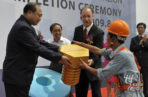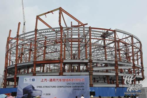 8月26日上午,2010年上海世博會上汽-通用汽車館鋼結(jié)構(gòu)正式封頂,標(biāo)志性的螺旋型建筑外觀雛形初現(xiàn)。上海世博局黨委副書記許偉國、上海汽車副總裁肖國普、通用汽車中國公司總裁兼總經(jīng)理甘文維等出席封頂儀式,共同見證最后一顆螺釘釘入鋼梁。