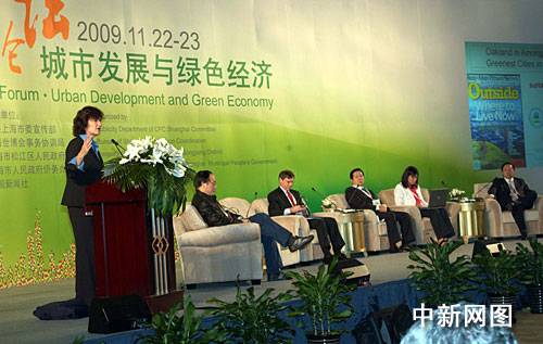 11月22日,世博論壇——城市發(fā)展與綠色經(jīng)濟(jì)在上海松江開(kāi)幕。在當(dāng)天下午的專(zhuān)題論壇上,美國(guó)奧克蘭市市議會(huì)議長(zhǎng)簡(jiǎn)·布萊尼、美國(guó)圣安東尼奧市綠色工作委員會(huì)主席萊瑞·金、中國(guó)信陽(yáng)市市長(zhǎng)郭瑞民、美國(guó)庫(kù)比蒂諾市副市長(zhǎng)胡宜蘭、中國(guó)洛陽(yáng)市市長(zhǎng)郭洪昌等中外城市管理者同臺(tái)熱議“綠色經(jīng)濟(jì)”。張亨偉 攝