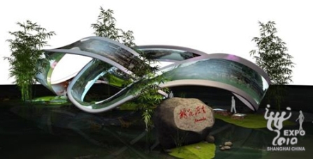 湖南館取名為“桃花源里·Xanadu”——Xanadu英文意為“世外桃源”,是西方世界描述神秘仙境時(shí)最廣泛使用的詞。湖南館的展示主題是“都市桃花源”。展館外觀之所以采用雙“魔比思環(huán)”相扣的造型,是取義無(wú)窮大符號(hào)“∞”和中國(guó)太極,這與和諧自然的中國(guó)理想城市意境以及長(zhǎng)株潭城市群“兩型社會(huì)”的理念相契合。“魔比思環(huán)”是雙環(huán)環(huán)繞,就單環(huán)而言展開(kāi)長(zhǎng)度達(dá)100米,高3米,只有一個(gè)面和一個(gè)邊界。由于主體造型是不規(guī)則的建筑環(huán)體,對(duì)施工和投影都帶來(lái)了重大挑戰(zhàn)。