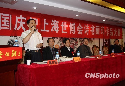 1月16日,中國(guó)慶祝上海世博會(huì)詩(shī)書(shū)畫(huà)印作品大賽在北京吳東魁藝術(shù)館啟動(dòng)。大賽結(jié)束后,將篩選出300余幅優(yōu)秀作品在北京進(jìn)行拍賣(mài),全部利潤(rùn)將捐獻(xiàn)給中國(guó)社會(huì)工作協(xié)會(huì),用于四川災(zāi)區(qū)公益文化事業(yè)。中新社發(fā) 王彤 攝