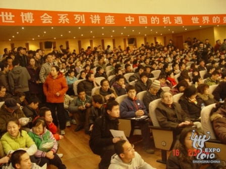 當(dāng)日下午1點,距離講座開始還有一個多小時,陜西省圖書館報告廳門前已經(jīng)排滿聽眾。報告廳講臺以上海世博會中國館為背景,會場內(nèi)張貼著上海世博會海報,講座之前播放了上海世博會的專題宣傳片。報告廳有300多個座位,工作人員臨時加了板凳,還有相當(dāng)多的聽眾站在走道上。下午2點30分,吳建中在熱烈的掌聲中走上講臺,以精彩、生動的語言,豐富、翔實的多媒體資料,介紹了上海世博會的理念與形態(tài),還就世博會的歷史、功能、意義,以及中國2010年上海世博會的主要內(nèi)容一一作了介紹;為聽眾詮釋了世博會的主題及其文化和理念,展示了世博會的風(fēng)貌和魅力。演講進入互動環(huán)節(jié),聽眾對如何參與上海世博會十分關(guān)心,吳建中耐心細(xì)致地與聽眾進行了交流。