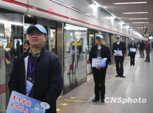 隨著世博會(huì)的臨近,上海市國資委的黨員志愿者們積極響應(yīng)市委、市政府的號(hào)召,持續(xù)深入地開展“世博先鋒行動(dòng)”。日前,市國資委機(jī)關(guān)的40多名黨員志愿者們來到人民廣場地鐵一號(hào)線,他們佩戴著標(biāo)有“世博先鋒行動(dòng)”的藍(lán)色識(shí)別帽,手持印有“有序等候,先下后上”的文明提示語標(biāo)牌,熱情服務(wù)乘客。圖為2月25日,志愿者們?cè)诘罔F站服務(wù)乘客。中新社發(fā) 毛昭勝 攝