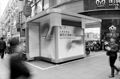 記者所見的這個“七彩之心”站亭,屬于外建站,地處徐匯區(qū)商業(yè)街“永新坊”,不過7平方米,主要材料為耐高溫、耐潮濕、耐風雨的彩鋼板。外形四四方方,看上去,與東方書報亭差不多大小,主色調(diào)為白色,四周邊沿則以七色裝飾,如彩帶縈繞。正面卷簾門板上,印著志愿者標志——七彩的志愿者之“心”,“上海世博會城市志愿服務(wù)站”幾個大字十分醒目。左、右兩側(cè)的門板上,同樣繪有世博會標志和志愿者標志,以及世博會志愿者口號:“世界在你眼前,我們在你身邊”。在站亭的正上方,有一條LED滾動顯示屏,滾動著“城市,讓生活更美好”等宣傳標語。