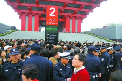 上午10點(diǎn),由于人流過(guò)于擁擠,亞洲廣場(chǎng)旁的預(yù)約點(diǎn)預(yù)約機(jī)陷入癱瘓,全面停止了預(yù)約。工作人員在現(xiàn)場(chǎng)用擴(kuò)音機(jī)與排隊(duì)的參觀(guān)者隔空喊話(huà),大約10多分鐘后,人潮漸漸散去。對(duì)于這個(gè)突發(fā)的情況,預(yù)約點(diǎn)的工作人員表示,希望參觀(guān)者可以自行分流,雖然有些預(yù)約點(diǎn)的地理位置離中國(guó)館相對(duì)較遠(yuǎn),但每張預(yù)約券都預(yù)留了至少1個(gè)小時(shí)的提前量,如果9點(diǎn)打印的預(yù)約券,上面的預(yù)約時(shí)間至少是10點(diǎn)以后,因此,無(wú)論在展區(qū)的任何一個(gè)預(yù)約點(diǎn)預(yù)約,走到中國(guó)館參觀(guān)都是來(lái)得及的。