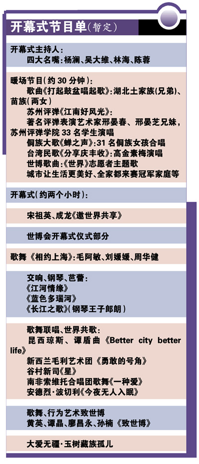 作為全世界人民的世博會,上海世博會開幕式將是中華風情和世界潮流的融合,“節(jié)目很精彩,大牌很多!眳⒓恿耸啦╅_幕式彩排的邢女士告訴記者。正式演出時,首先登場的是宋祖英和成龍,一曲《邀世界共享》,向全世界人民發(fā)出邀請。在歌聲中,56個民族身穿華服,還夾雜著雜技、飛天、長城等中國專屬符號,非常具有民族特色。隨后出場的毛阿敏、周華健、劉媛媛,用一曲《相約上!罚砹松虾O蚴澜绨l(fā)出世博的邀請。