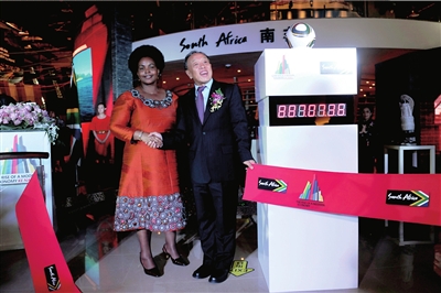 南非世界杯將于6月11日開(kāi)幕,這是世界最高級(jí)別的足球盛會(huì)首次踏足非洲大陸。世博會(huì)南非館開(kāi)館儀式上,李肇星與南非國(guó)際關(guān)系與合作部長(zhǎng)馬沙巴內(nèi)共同摁下了南非世界杯的倒計(jì)時(shí)牌!笆澜绫陂g,世博會(huì)南非館將不間斷播放世界杯比賽,歡迎大家來(lái)看!”馬沙巴內(nèi)向參觀者發(fā)出了邀請(qǐng)。