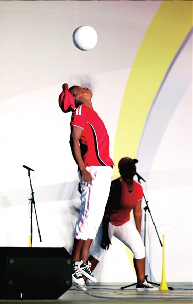 隨后,演員們?cè)诜侵迯V場(chǎng)跳起南非世界杯的官方舞蹈。6位舞蹈演員身著紅色的南非國(guó)家隊(duì)隊(duì)服,在明快強(qiáng)勁的非洲音樂(lè)伴奏下跳起了足球舞,每個(gè)動(dòng)作都跟足球有關(guān),或是頂球、或是傳球、或是顛球……在場(chǎng)的每個(gè)人都為足球的激情所感染。