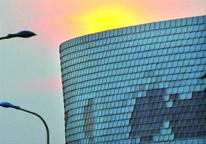 為什么帷幕能發(fā)電?原因就來(lái)自于帷幕上掛著的那1萬(wàn)個(gè)“小太陽(yáng)”,每個(gè)“小太陽(yáng)”都有1塊內(nèi)嵌太陽(yáng)能智能電池板,可以吸收光能而發(fā)出閃光。據(jù)介紹,這些小太陽(yáng)的學(xué)名是聚碳酸酯板,每個(gè)20厘米見(jiàn)方,包括一個(gè)能量發(fā)生器、一個(gè)存儲(chǔ)介質(zhì)和一個(gè)LED形式的電力負(fù)載。吸收太陽(yáng)光后,產(chǎn)生的能量可以轉(zhuǎn)換為白色燈光。在游客的照相機(jī)閃光燈閃亮?xí)r,“小太陽(yáng)”便會(huì)回閃,如同在對(duì)你眨眼睛一般。隨之,它周?chē)摹班従印痹诟兄獎(jiǎng)屿o后,形成“多米諾效應(yīng)”,整個(gè)外墻就會(huì)閃成一片紅色光海。值得一提的是,1萬(wàn)個(gè)“小太陽(yáng)”白天在吸收太陽(yáng)能和其他光能后,晚上就能為展館燈光供電。