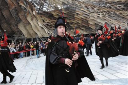 昨天(17日)下午,50位穿著十八世紀(jì)傳統(tǒng)服裝的風(fēng)笛手在西班牙國家館的廣場上演奏傳統(tǒng)音樂,開啟了世博會西班牙國家館加里西亞周的活動。