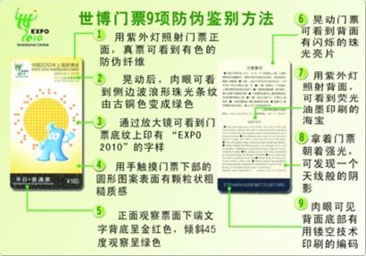 世博會(huì)園區(qū)現(xiàn)場(chǎng)白蓮涇、高科西路、長(zhǎng)清北路、上南路、后灘、魯班路、西藏南路、半淞園路、馬當(dāng)路、東昌路水門等10個(gè)出入口,銷售當(dāng)日普通票、當(dāng)日優(yōu)惠票、當(dāng)日夜票等三種門票。