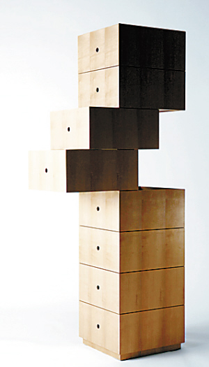 這個由女設(shè)計(jì)師Tadao Hoshino設(shè)計(jì)的“異形”抽屜組合,靈感來自于一位女性不斷膨脹的儲物愿望。同為女性,女設(shè)計(jì)師Hoshino比任何人都明白女士們總會不斷購買服飾而讓自己的抽屜不堪負(fù)荷。這個組合家具共有八個相同的抽屜,雖然每個抽屜的樣子并不特別,只是四方的木質(zhì)抽屜,然而每個抽屜的排列方式卻很特別,形成了一種組合的趣味。(陳薇薇、陳晶晶)