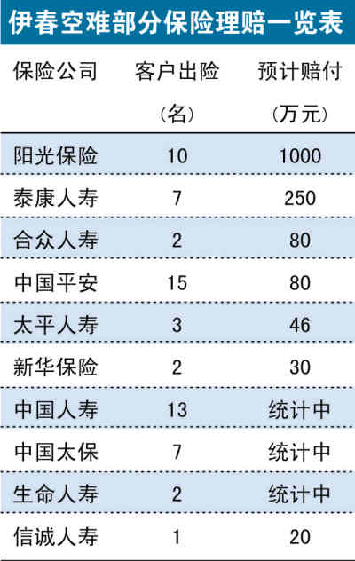 根據(jù)中國(guó)保監(jiān)會(huì)發(fā)布的公告,經(jīng)初步確認(rèn),遇難人員中有27人在14家保險(xiǎn)公司投保了人身險(xiǎn),預(yù)計(jì)賠付1487萬(wàn)元。其中,15人投保航意險(xiǎn),保額700萬(wàn)元;12人投保意外傷害保險(xiǎn),保額647萬(wàn)元;16人投保其他壽險(xiǎn)產(chǎn)品,保額140萬(wàn)元。目前,排查工作還在進(jìn)行中。