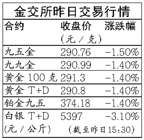 金價從上周五開始“四連跳”,受此影響,昨日國內(nèi)金價也震蕩收低,跌幅達1.44%。