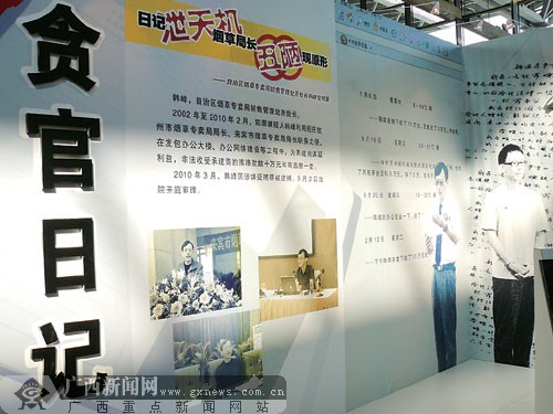 韓峰雖然只是一名處級干部,但他犯罪后卻能與昔日的廳級、省部級高官“同處一室”。不僅如此,昔日高官都被懸掛在展板上,多的是一兩張相片,少的寥寥幾句,韓峰卻獨(dú)占一席之地:展覽專門開辟一個(gè)展臺(tái),以“貪官日記”為主題,展出韓峰受審和日記時(shí)間摘要等情況。此外,該展臺(tái)還獨(dú)享一臺(tái)液晶電視機(jī),單獨(dú)播放韓峰懺悔、受審的情況。