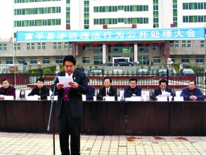 回應(yīng):記者在富平縣法院網(wǎng)看到該網(wǎng)站刊載了一張公開處理大會的照片,3月5日當天,站在富平縣政府廣場上念稿子的官員正是該縣法院副院長奧繪。背后列席的官員中,該縣政法委及法院的主要領(lǐng)導(dǎo)都在。