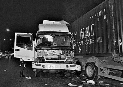中新網(wǎng)7月9日電 據(jù)香港文匯報報道,香港屯門公路8日凌晨發(fā)生嚴重車禍。一輛密斗貨車疑在路面左穿右插失事,狂撼前面一輛貨柜車車尾,致?lián)躏L玻璃甩脫;前座司機妻子疑沒有佩戴安全帶,如炮彈般從車頭飛出車外,再被密斗貨車卷入車底,左臂被車輪輾壓重傷。