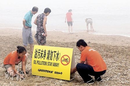 環(huán)保組織綠色和平昨日指出,受漏油意外污染的大連一帶海域,黑色油污已漸被清理,但海面仍漂浮油層。為保護(hù)游客安全,綠色和平在棒棰島等海濱浴場(chǎng)已豎立警示牌,提醒游人“油污未凈,請(qǐng)勿下水!”