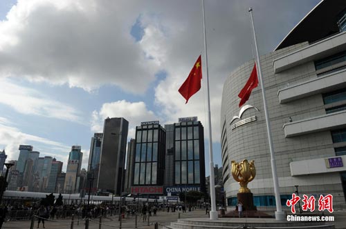 中新社香港8月26日電 (記者 曾嘉)26日晨8時(shí),全香港默哀3分鐘,悼念菲律賓劫持人質(zhì)事件中遇害的8位港人。行政長官曾蔭權(quán)率司局長與中央駐港機(jī)構(gòu)官員在灣仔金紫荊廣場(chǎng)出席升旗及下半旗儀式,百多名市民自發(fā)前來哀悼同胞。