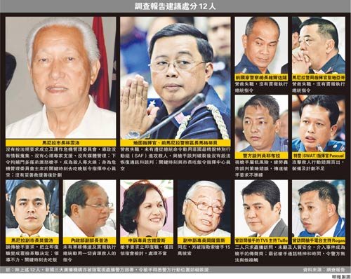 阿基諾三世昨在記者會上透露,調(diào)查報告建議他對12名官員及傳媒工作者作行政或刑事檢控,包括市長林雯洛、內(nèi)政部副部長普洛、正副申訴專員、前警察總長、談判專家、特警指揮官及當(dāng)日與門多薩做直播訪問的電臺節(jié)目主持人等。