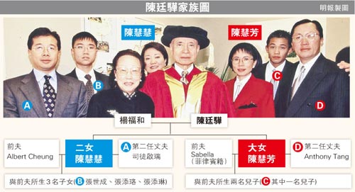 至于其妹陳慧慧,近年已出任南豐集團(tuán)董事長(zhǎng)兼董事總經(jīng)理,她與前夫所生的3名子女張世成、張?zhí)礴蠛蛷執(zhí)砹站完懤m(xù)加入南豐管理層,在陳廷驊在2008 年退休之后,其家庭勢(shì)將接掌整個(gè)南豐王國。其母楊福和日前于入稟狀就指出,陳慧慧于2003至2005年曾向父親作出虛假陳述,以致出現(xiàn)家族財(cái)產(chǎn)轉(zhuǎn)移,但當(dāng)中未有透露具體與哪些財(cái)產(chǎn)有關(guān)。