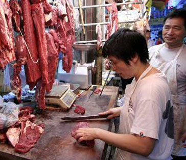“資料圖:2007年8月23日”香港五豐行決定再調(diào)高活牛批發(fā)價后,2007年8月23日,有街市肉檔將零售價調(diào)高10%,但來貨量仍然緊張。據(jù)鮮肉大聯(lián)盟主席文灼培當(dāng)日表示,五豐行只有38只內(nèi)地活牛到港。 中新社發(fā) 譚達明 攝