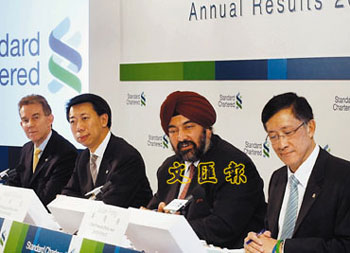 二月二十六日,渣打集團(tuán)在香港舉行二零零七年度全年業(yè)績(jī)發(fā)布會(huì)。集團(tuán)在二零零七年全年盈利錄得增長(zhǎng)百分之二十五(25%),達(dá)二百一十九點(diǎn)四一億港元(219.41),其中經(jīng)營(yíng)收入八百六十三點(diǎn)二三億港元(863.23),增長(zhǎng)百分之二十八(28%)。在香港業(yè)務(wù)方面,渣打香港除稅前營(yíng)利九十三點(diǎn)零五億港元(93.05),上升百分之三十四(34%),經(jīng)營(yíng)收入有一百六十一點(diǎn)三億元(161.3),增長(zhǎng)百分之二十八(28%)。圖為渣打集團(tuán)高層出席業(yè)績(jī)發(fā)布會(huì)。 中新社發(fā) 鄧慶樂 攝